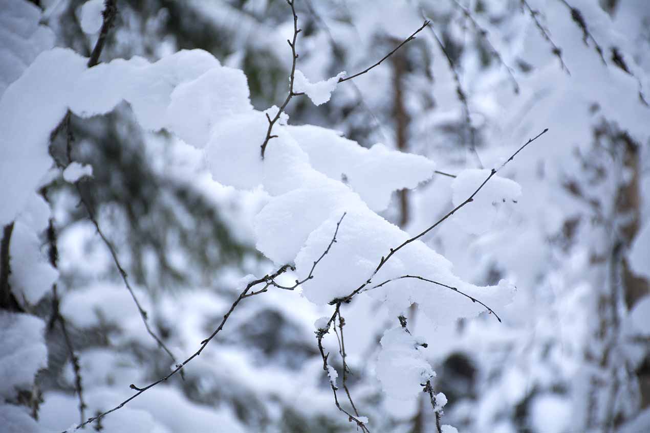 På bar kvist ligger en massa fluffig snö.