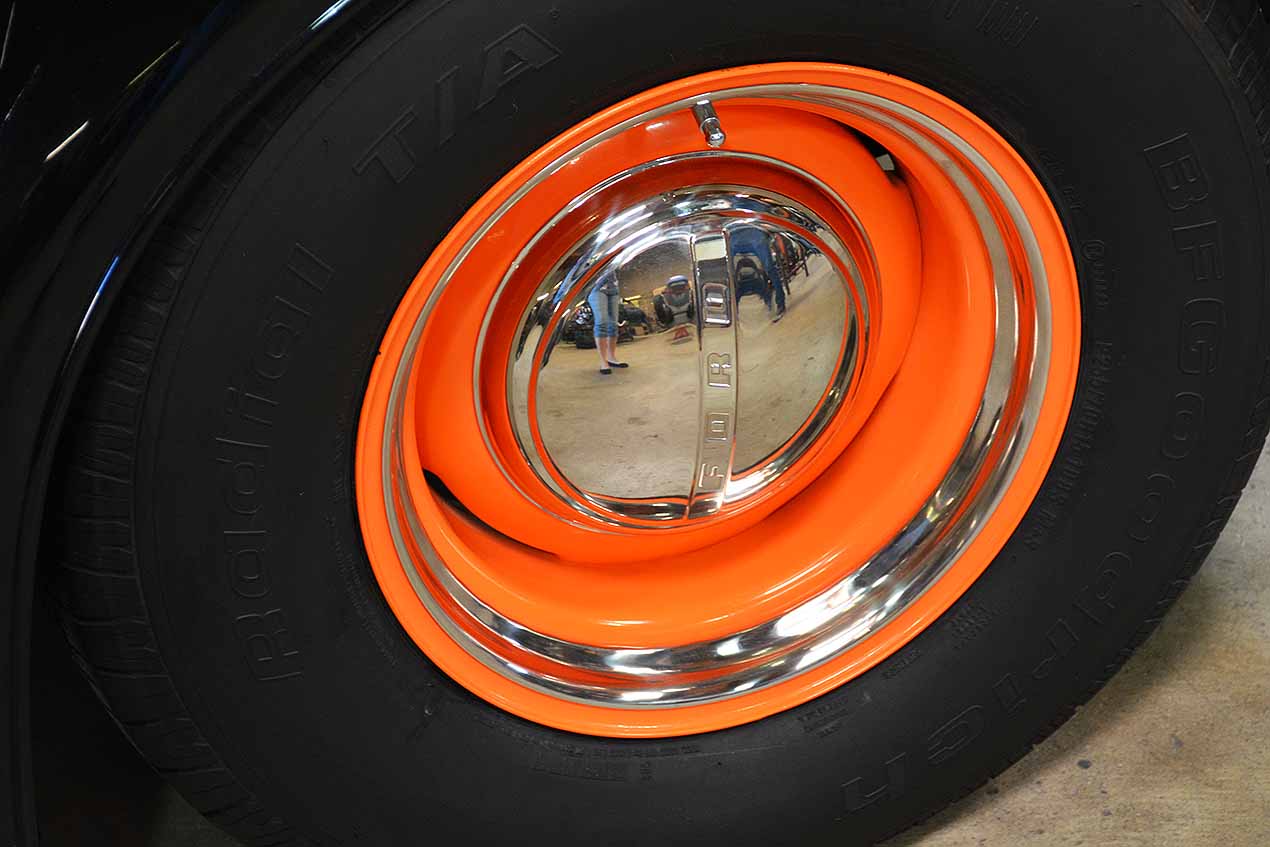 Mina fötter speglas i fälgen på en hotrod på So-Cals Speed Shop i Los Angeles.