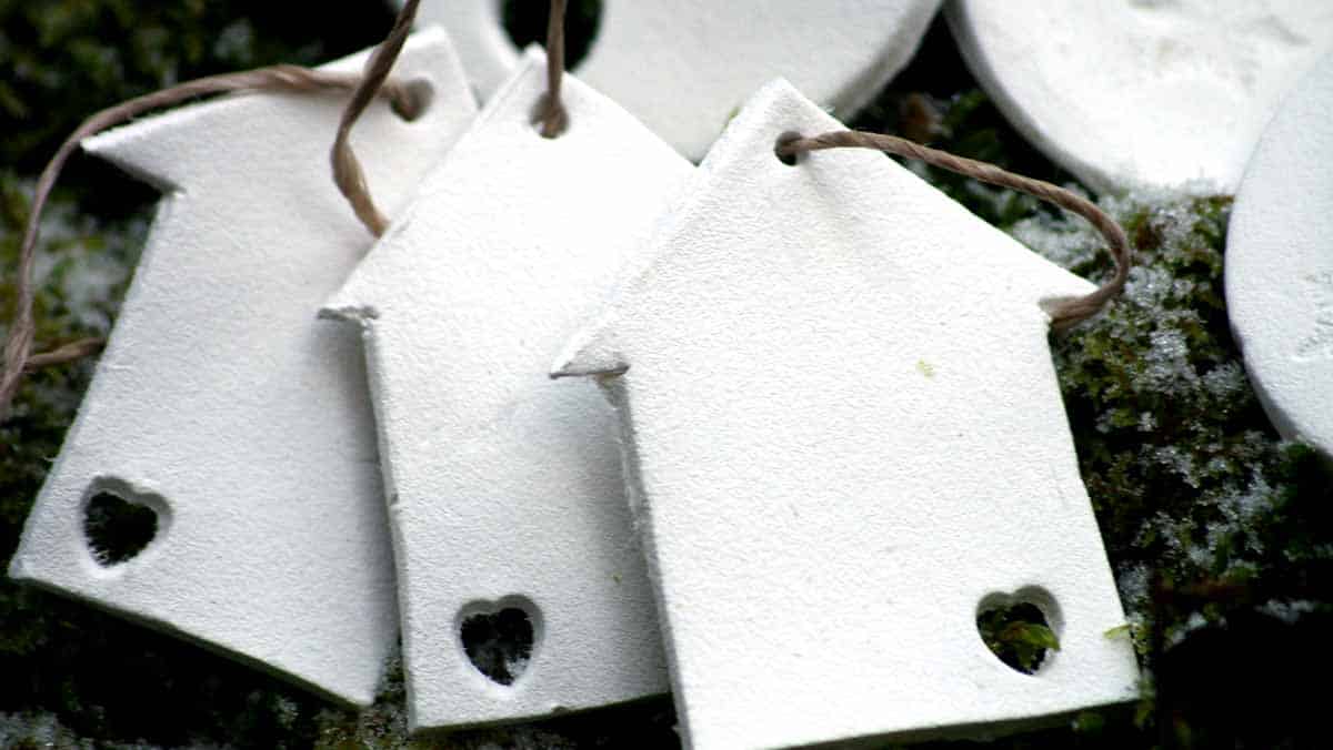 Ett julgranspynt gjorde jag av vit lera som jag köpte på Panduro. Jag kavlade ut den och stansade ut med olika pepparkaksformar. De små hjärtformade hålen gjorde jag med en ministans som jag tror kom från Panduro. När jag gjort de små hålen för snören ”bakade” jag dem i ugnen till de stelnade. När de kallnat trädde jag snören eller band i de små hålen och de var klara att användas.