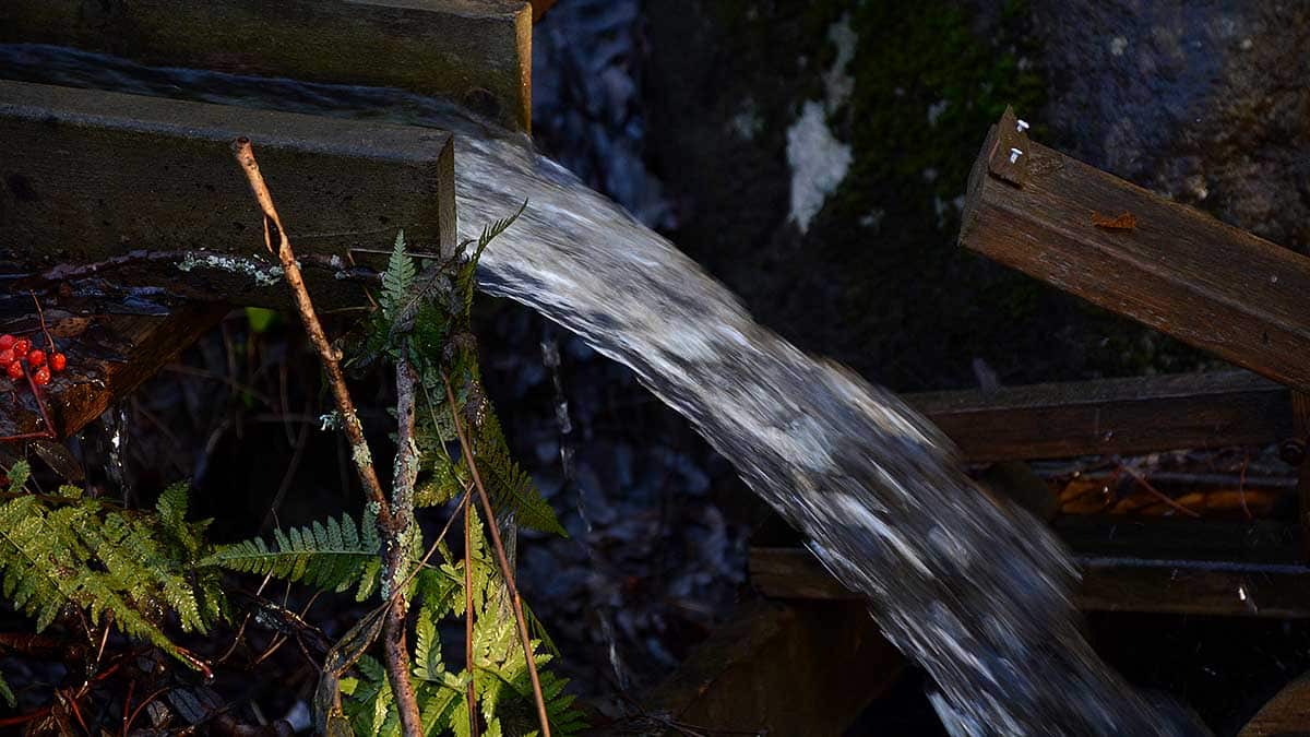 På första bilden ser man en del av en ränna som barnens farfar byggde tillsammans med barnen när de var små. I änden fanns det ett vattenhjul som smällde och förde ett hiskeligt ljud när det var igång. Barnen tyckte givetvis det var jätteroligt. För det mesta rinner det aldrig vatten i rännan men när bäcken är full som nu så forsar det igen.