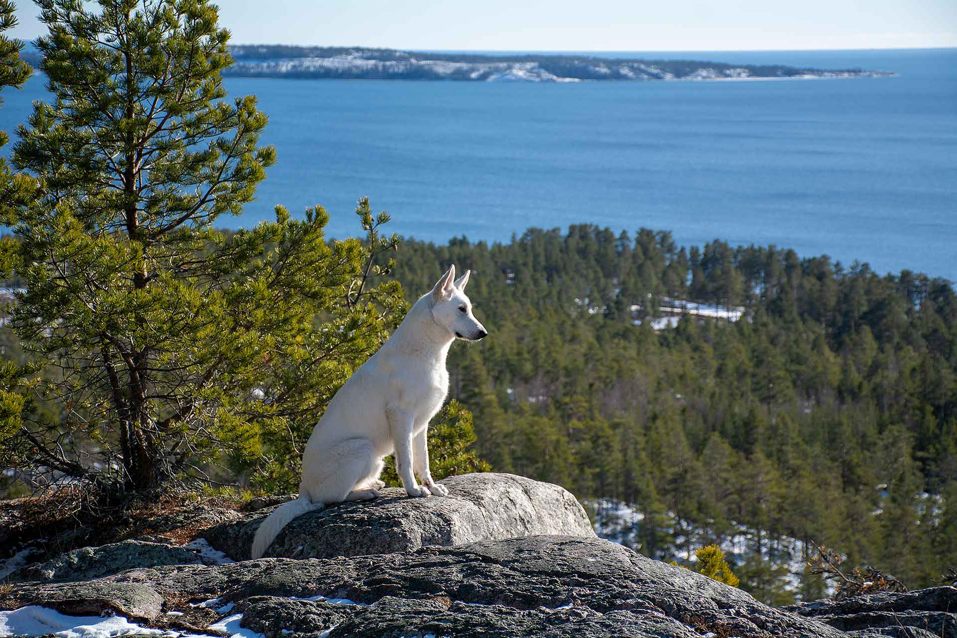 Jag illustrerar mitt första inlägg med två bilder från en promenad jag och maken gjorde i fredags. Vi gick upp på Ögeltjärnsberget i strålande vackert väder. På första bilden sitter Guzzi och spanar och här nedanför är det Nova.